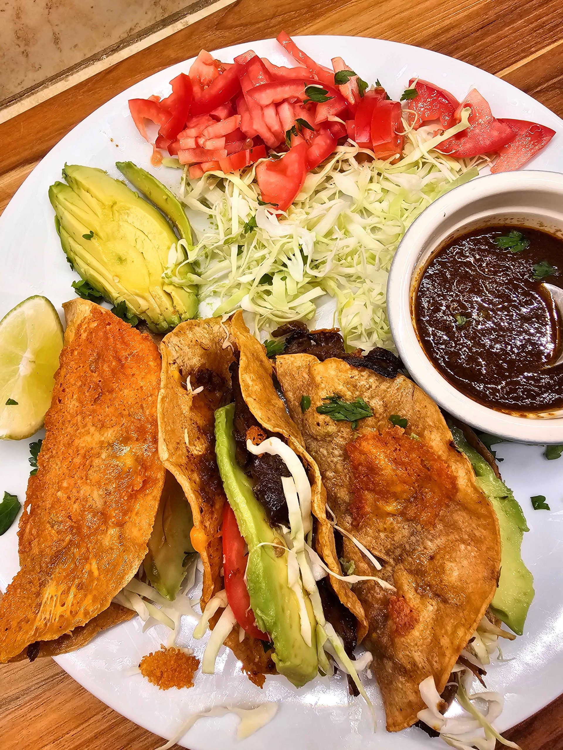- Serve with finely shredded cabbage, tomato, avocado, and salsa.
