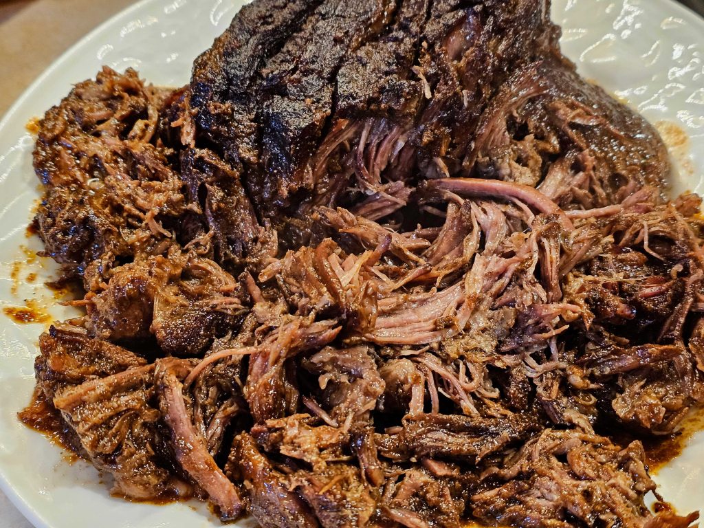 - Cover and roast at 300 degrees for 3-4 hours, spooning the sauce over the meat several times, until tender. If using a cast iron or oven safe skillet, cover with foil. The meat will be super tender when pulled apart with a fork. Salt and pepper to taste.