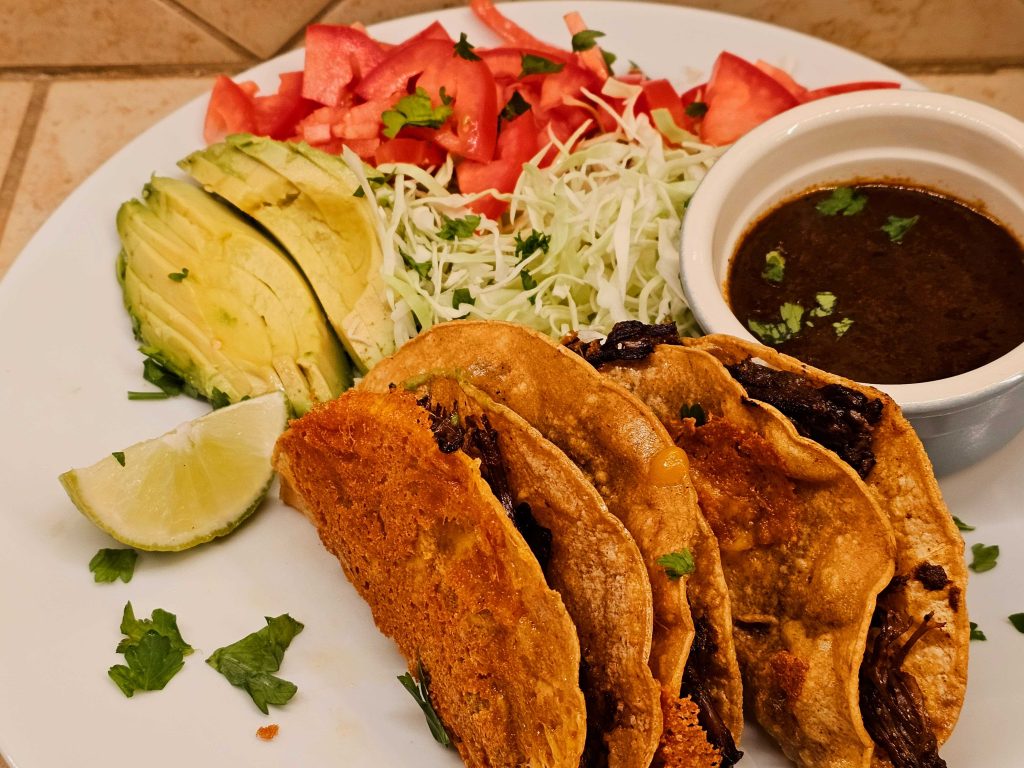 - Heat a skillet with a spray of oil. Add 2 or 3 corn tortillas. Turn over a few times. Add a small amount, a teaspoon of the birria sauce, then add some of the beef and a small amount of cheese to the inside, then fold over. Add cheese to the outside and cook until browned. If desired, add a small amount of sauce to the outside or serve the sauce alongside the tacos, for dipping.