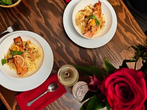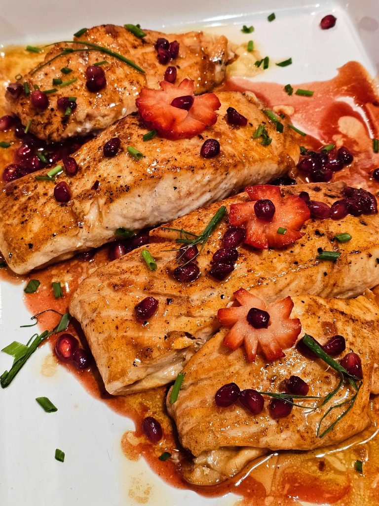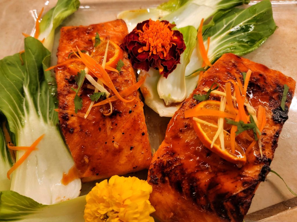 Our firecracker salmon, potentially a strong contender for the second position, offers a vibrant flavor profile that beautifully complements the inherent taste of the salmon. I recommend pairing this dish with sides such as sautéed bok choy or seared green beans with garlic. Additionally, a simple Jasmine rice would serve as an excellent accompaniment. Given the rich flavors of the salmon, an elaborate side dish is not necessary. Maybe choose to plate with some edible flowers like I did here, or simply plate with sesame seeds, green onion or chives, and orange slices.