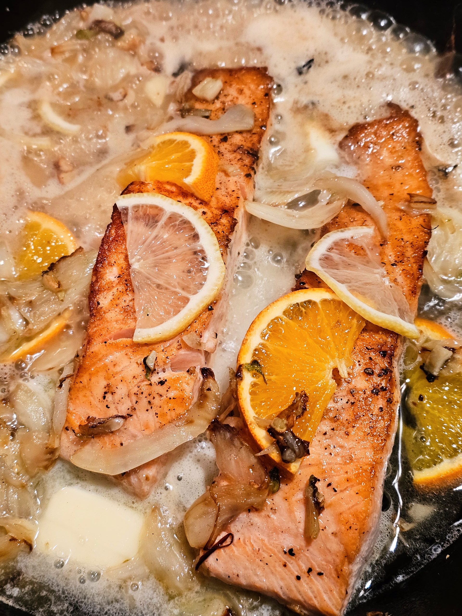 - Add a drizzle of olive oil to the skillet. Next add the salmon pieces, top side down to the skillet. Sear over medium high heat for 3-4 minutes. Gently turn the pieces over. Add several lemon and orange slices to the top of the salmon pieces. Next add the fennel, garlic, and shallots back in, followed by the butter, white wine, lemon and orange juice, crushed red pepper, plus a pinch of salt. Simmer for a few minutes before moving to the oven.