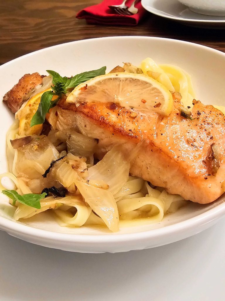 Okay, we’re going back to where we started, with our delicate flaky salmon with tender and subtle fennel flavors and slightly bolder citrus flavors. I’ve always loved fennel. Even eating it raw as a kid. Also, I loved licorice, which has a similar flavor. If you don’t love it, it’s honestly not too strong in this dish. The sauteing with the garlic and shallots if you use them, is a perfect blend of flavors.